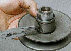 РАЗБОРКА ЦЕНТРОБЕЖНОГО СЦЕПЛЕНИЯ И ВЕДОМОГО ДИСКА Чтобы отделить механизм центробежного сцепления от ведомого шкива, открутите соединяющую их гайку. Она обычно затянута с моментом не меньше 50-55 Н-м, а для того, чтобы ее открутить, понадобится еще большее усилие.