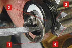 Чтобы разобрать этот узел, снимите с помощью двух тонких отверток седло пружины, извлеките плоскогубцами с тонкими губками направляющие штифты (их два или три - в зависимости от модели скутера) и снимите подвижную щеку шкива с вала неподвижной. Оцените, не пора ли заменить кольцевые резиновые уплотнения. Перед сборкой смажьте трущиеся поверхности тонким слоем консистентной смазки. После того, как вставите штифты, не забудьте смазать и винтовые канавки. Чтобы, осаживая седло пружины, не повредить резиновые кольца, смажьте их, а седло слегка поворачивайте. Начинаем разборку привода кикстартера: снимаем стопорную шайбу (1); фигурную шайбу (2); пружину (3);