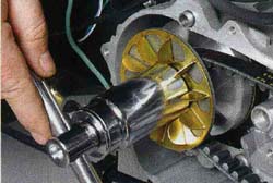... а другой при помощи глубокой головки откручивает гайку, крепящую узел ведомого шкива...