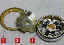 Муфта вариатора разобрана: 1 - крышка муфты; 2 - подвижная пластина; 3 - корпус муфты с грузиками.