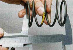 Поэтому узел лучше зажать в тисках. Гайка здесь узкая, чтобы не испортить ее грани, воспользуйтесь головкой или накидным (но не рожковым!) ключом. Будьте готовы к тому, что вам может понадобиться инструмент нестандартного размера, например «под ключ» 34 мм, как на нашем скутере. Открутив гайку, вы получите доступ к одной из деталей, определяющих характеристику вариатора - пружине, сдвигающей половинки ведомого шкива. Измерьте ее длину штангенциркулем и проверьте - сравните размер с тем, что указан в справочной литературе: не просела ли она? Если пружина короче положенного, замените. Обратите внимание на цвет метки: он указывает группу жесткости, соответствующую определенному весу грузиков. Поэтому, если не"хотите, чтобы характеристика вариатора изменилась, ищите пружину с тем же цветом метки.