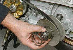 Если предстоит заменить всего лишь ремень, а центробежное сцепление и ведомый шкив трогать не собираетесь, то дальше этот узел разбирать не стоит. Чтобы снять ремень, разведите щеки ведомого шкива, преодолевая усилие пружины, и, утопив между ними ремень, снимите с вала весь узел. Замените ремень и собирайте в порядке, обратном разборке.